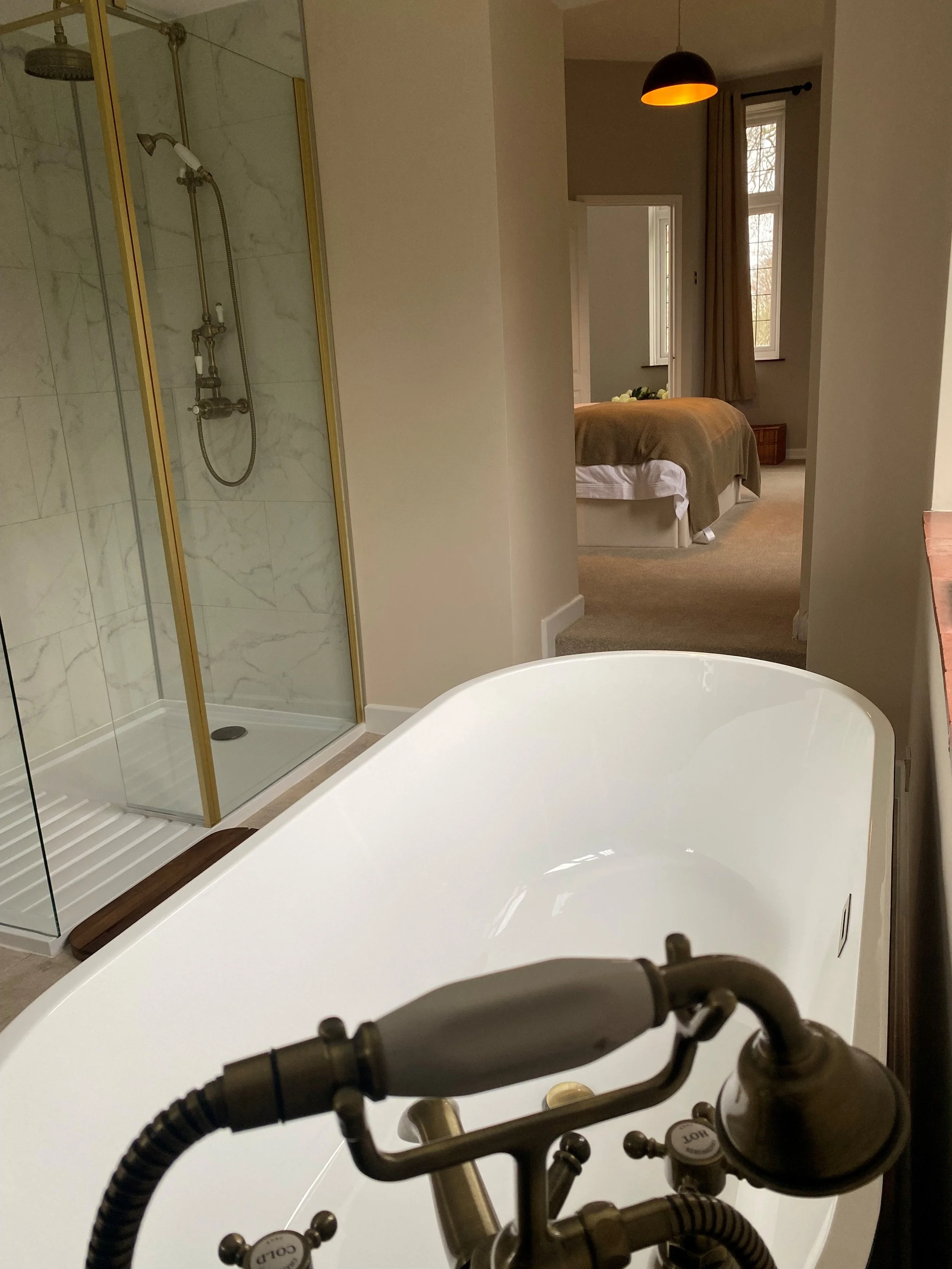 A luxurious bathroom designed for indulgent relaxation. Enjoy a freestanding bath with elegant fittings and soothing river views, alongside a spacious walk-in shower. The space flows seamlessly into the bedroom, creating a calm, spa-like retreat for a truly restful stay.
