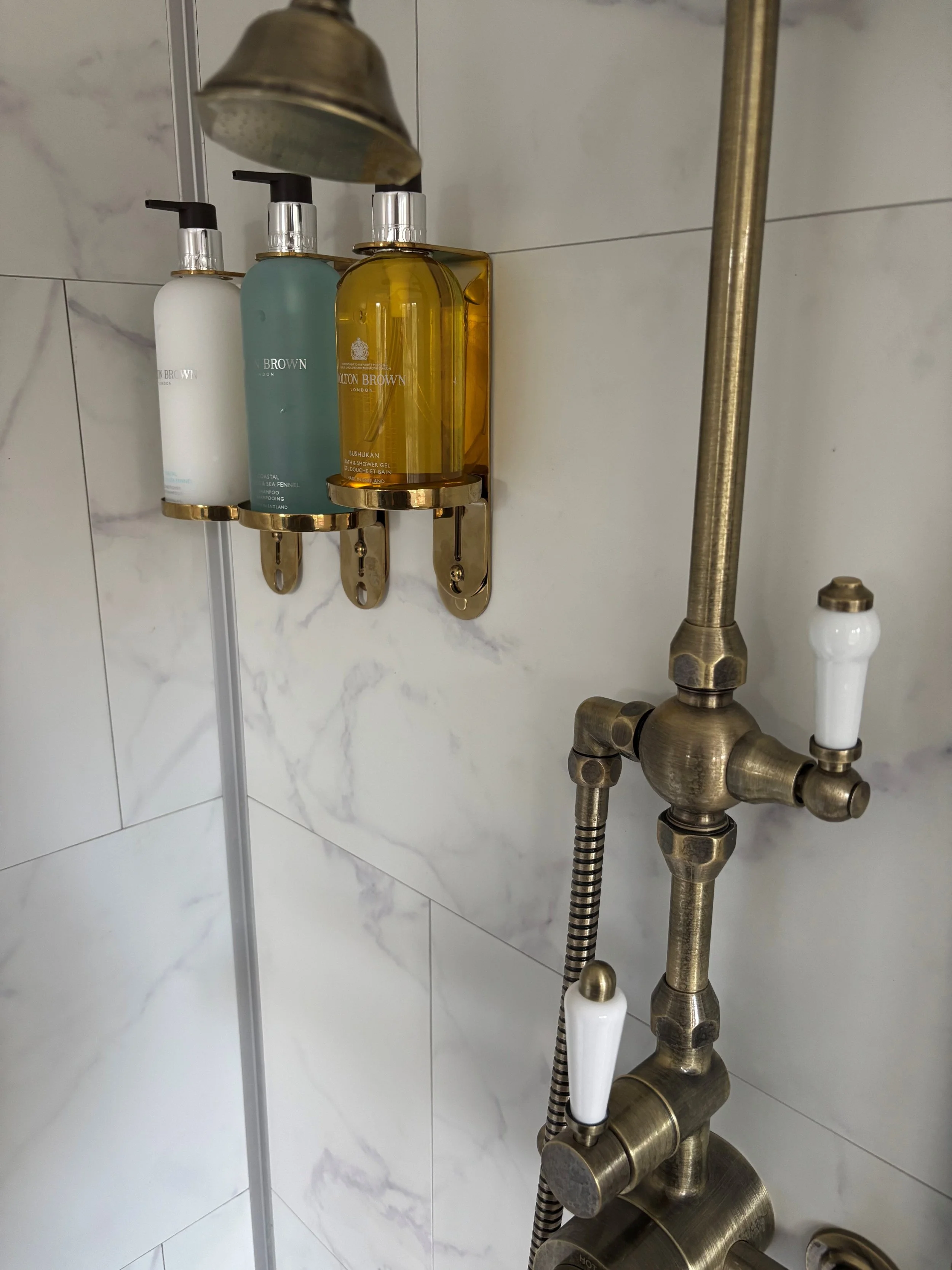 A large, indulgent walk-in shower with luxury toiletries and classic fittings