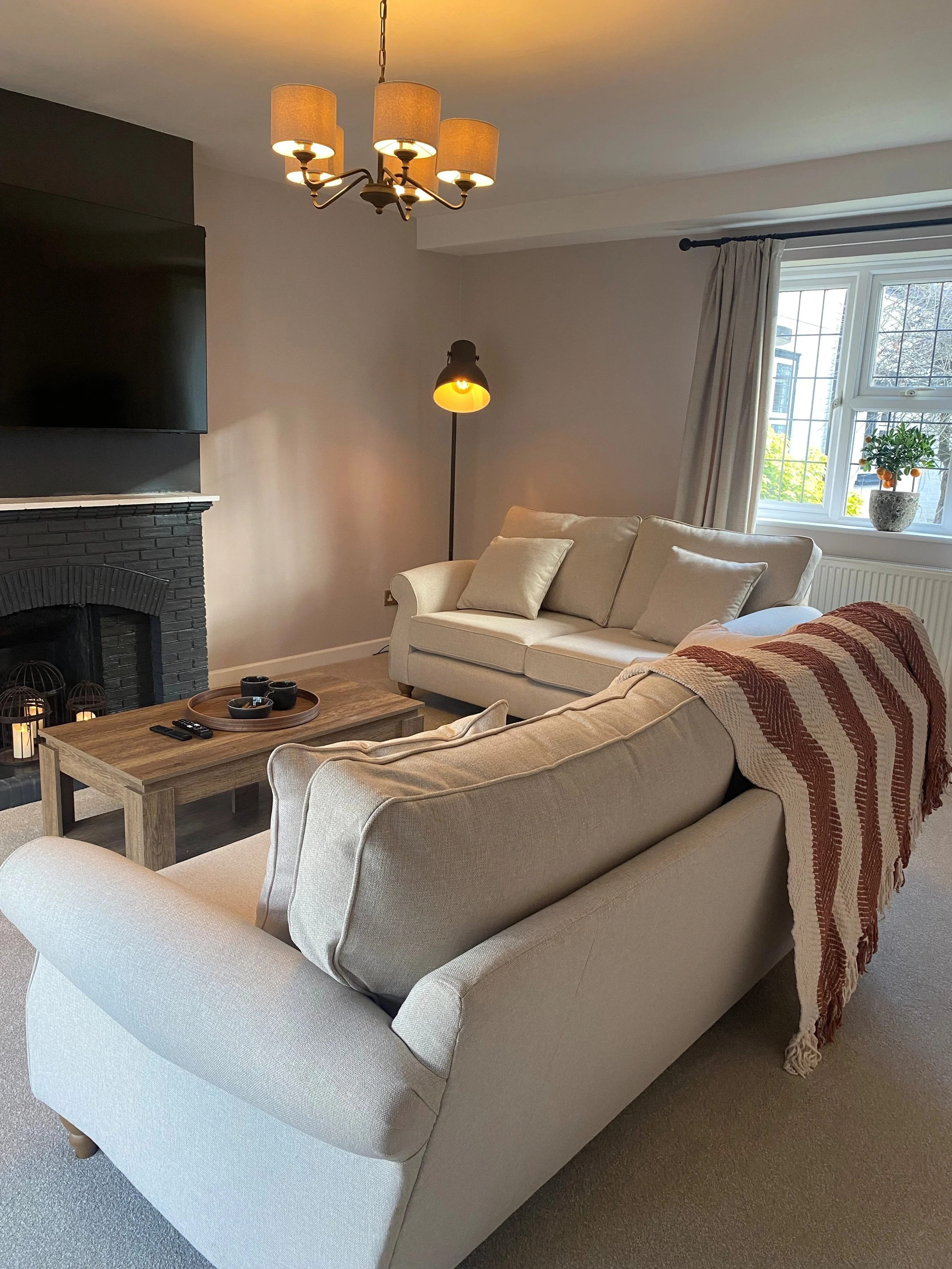 A cosy yet elegant living room made for unwinding. Relax into soft sofas, enjoy the comfort of plush carpets, and settle in front of the large TV. Light floods through the bay windows with leafy views, creating a warm, welcoming space to switch off..